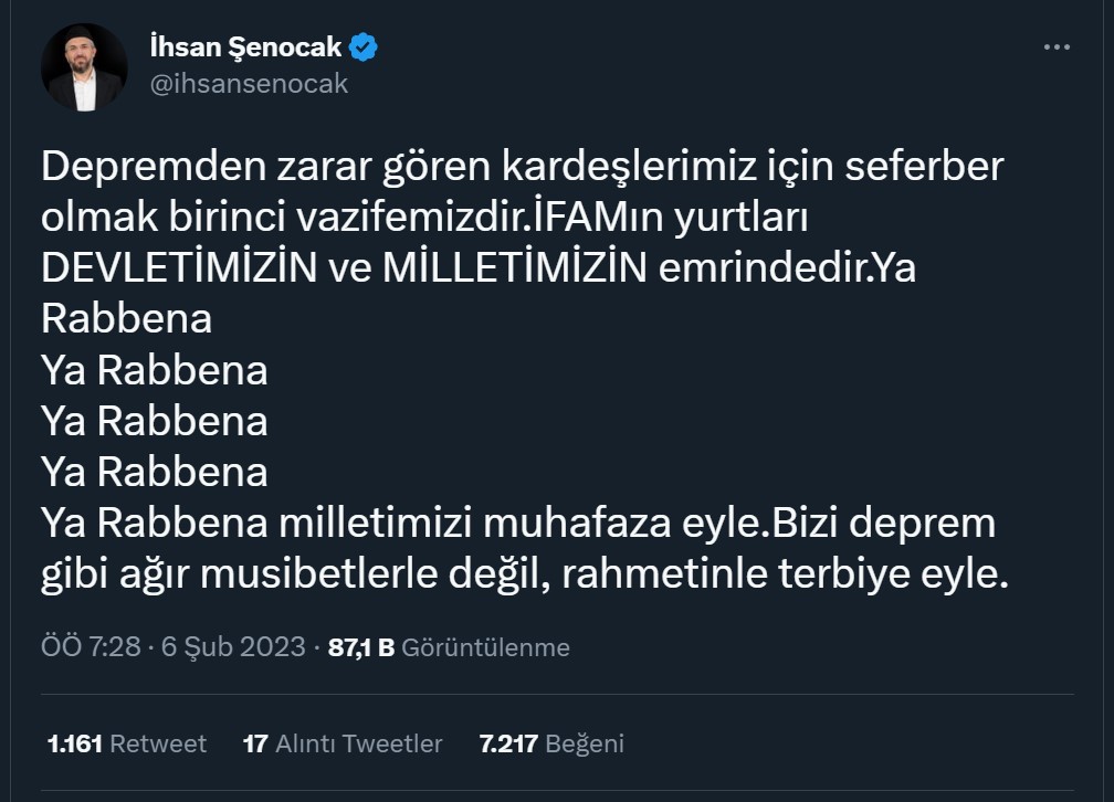 "Depremden zarar gören kardeşlerimiz için seferber olmak birinci vazifemizdir. İFAM'ın yurtları DEVLETİMİZİN ve MİLLETİMİZİN emrindedir. Ya Rabbena, Ya Rabbena, Ya Rabbena, Ya Rabbena, Ya Rabbena milletimizi muhafaza eyle. Bizi deprem gibi ağır musibetlerle değil, rahmetinle terbiye eyle."