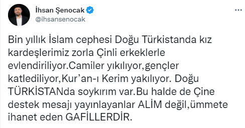 Çin zulmüne yönelik Twitter hesabından bir mesaj paylaşan Fıkıh Doktoru İhsan Şenocak, Müslümanlara önemli uyarılarda bulundu.