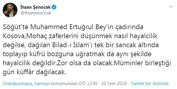 Şenocak, Twitter hesabından, "Söğüt'te Muhammed Ertuğrul Bey'in çadırında Kosova, Mohaç zaferlerini düşünmek nasıl hayalcilik değilse, dağılan Bilad-ı İslam'ı tek bir sancak altında toplayıp küfrü bozguna uğratmak da aynı şekilde hayalcilik değildir." diye yazdı.