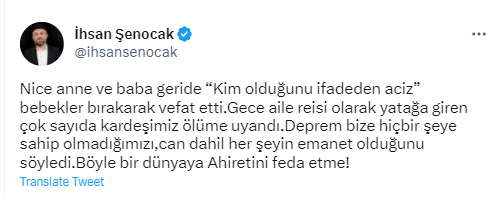Türk milletin yüreğini yakan deprem felaketine ilişkin açıklamada bulunan Fıkıh Doktoru İhsan Şenocak, depremden çıkartılması gereken mesajı aktardı.