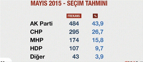 GENAR anketine göre; AK Parti 44.5, CHP 25.4, MHP 15.9, HDP 9.5, Diğer 3,9 şeklinde ortaya çıktı. GENAR Yönetim Kurulu Başkanı İhsan Aktaş, "son günlerde CHP ve MHP'nin oylarının seçim beyannamelerini açıkladıkları dönemdeki gibi bir hareketlilik yok. Mesela CHP beyannamesini açıkladığı dönemde 27 bandına çıkmıştı ancak son günlerde yaptığımız araştırmalara göre CHP tekrar 25'e düştü" dedi.