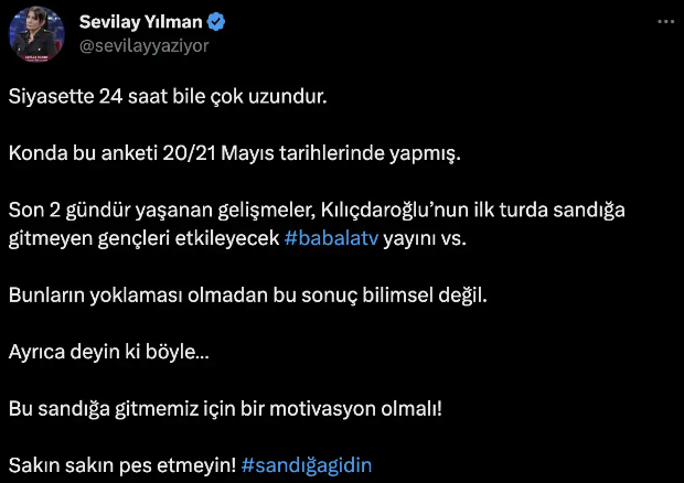 KONDA'nın seçim tahminlerine tek kelime etmeyen muhalefet ise, kendi yandaşlarının 2. tura inancı kalmayınca ayağa kalktı.