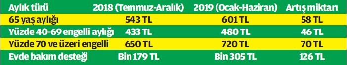 Devlet hiçbir geliri olmayan ve bakıma muhtaç kişileri yalnız bırakmıyor. Memur maaş katsayısı enflasyon oranında güncellenip Hazine ve Maliye Bakanlığı konuyla ilgili genelgeyi yayımlayınca bu yıl ödenecek maaş ve zam miktarları da belli oldu. Buna göre 2018’in ikinci yarısında 543.27 TL olan 65 yaş aylıkları, memur katsayısındaki artışla 601.58 TL’ye yükseldi. Aylıklar temmuzda memur maaş katsayısındaki artışla birlikte tekrar zamlanacak.