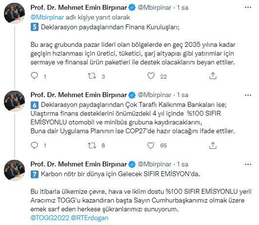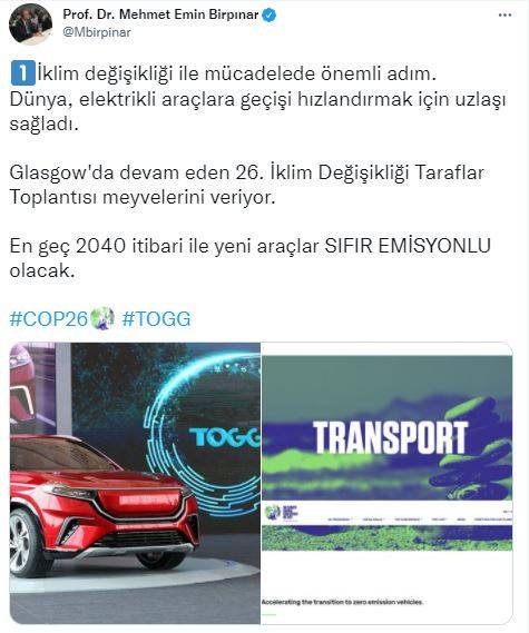Çevre, Şehircilik ve İklim Değişikliği Bakan Yardımcısı Mehmet Emin Birpınar, İklim Zirvesi'nde alınan sıfır emisyonlu araç kararına değinerek Türkiye'nin Otomobili TOGG'u referans gösterdi. Birpınar paylaşımında, "En geç 2040 itibari ile yeni araçlar sıfır emisyonlu olacak." diyerek TOGG'un elektrikli olarak üretileceğine dikkat çekti.