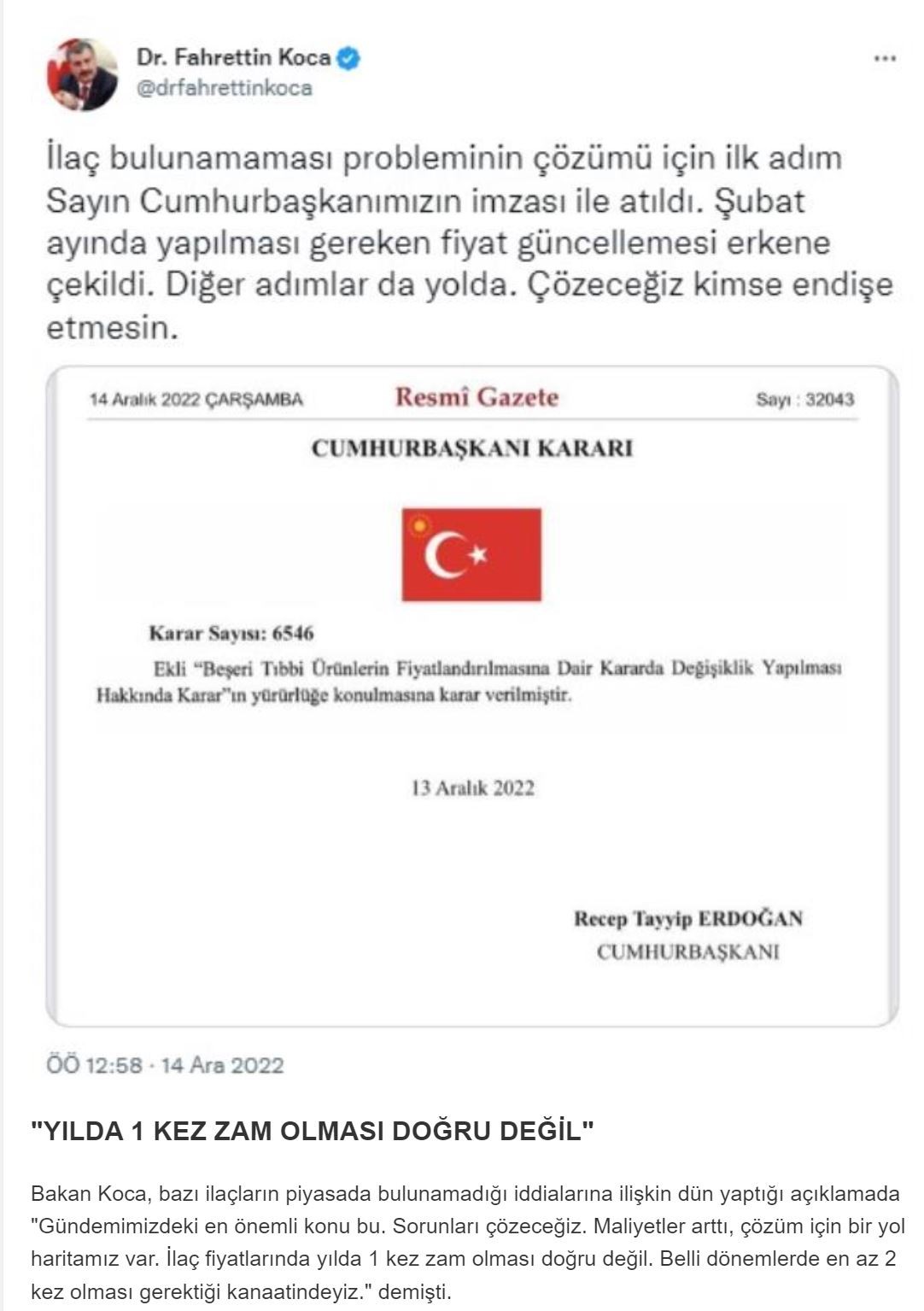 Karara ilişkin sosyal medya hesabından açıklama yapan Bakan Koca, "İlaç bulunamaması probleminin çözümü için ilk adım Sayın Cumhurbaşkanımızın imzası ile atıldı. Şubat ayında yapılması gereken fiyat güncellemesi erkene çekildi. Diğer adımlar da yolda. Çözeceğiz kimse endişe etmesin" dedi.