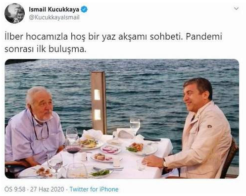 Küçükkaya’nın “İlber hocamızla hoş bir yaz akşamı sohbeti. Pandemi sonrası ilk buluşma” diyerek paylaştığı fotoğrafta sağ elinde alkol gizlediği iddiasıyla yüzlerce tepki geldi.