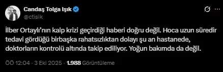 Ancak söz konusu iddialar, gazeteci Candaş Tolga Işık tarafından yalanlandı. Bir YouTube kanalında Ortaylı ile birlikte ortak program da yürüten Işık, sosyal medya hesabından konuya ilişkin yaptığı paylaşımda, "İlber Ortaylı'nın kalp krizi geçirdiği haberi doğru değil" dedi.