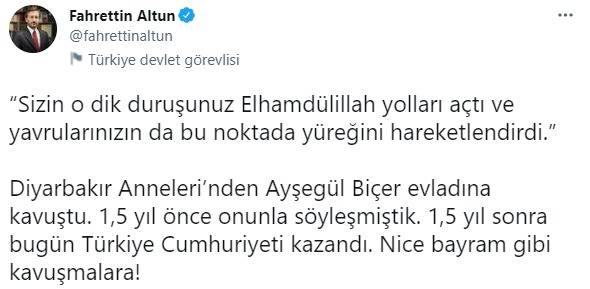 Diyarbakır annelerinde Ayşegül Biçer’in evladına kavuşmasının ardından İletişim Başkanı Fahrettin Altun sosyal medya hesabı üzerinden destek mesajı yayınladı. Altun yayınladığı mesajda, ““Sizin o dik duruşunuz Elhamdülillah yolları açtı ve yavrularınızın da bu noktada yüreğini hareketlendirdi.” Diyarbakır Anneleri’nden Ayşegül Biçer evladına kavuştu. 1,5 yıl önce onunla söyleşmiştik. 1,5 yıl sonra bugün Türkiye Cumhuriyeti kazandı. Nice bayram gibi kavuşmalara!” ifadelerini kullandı.