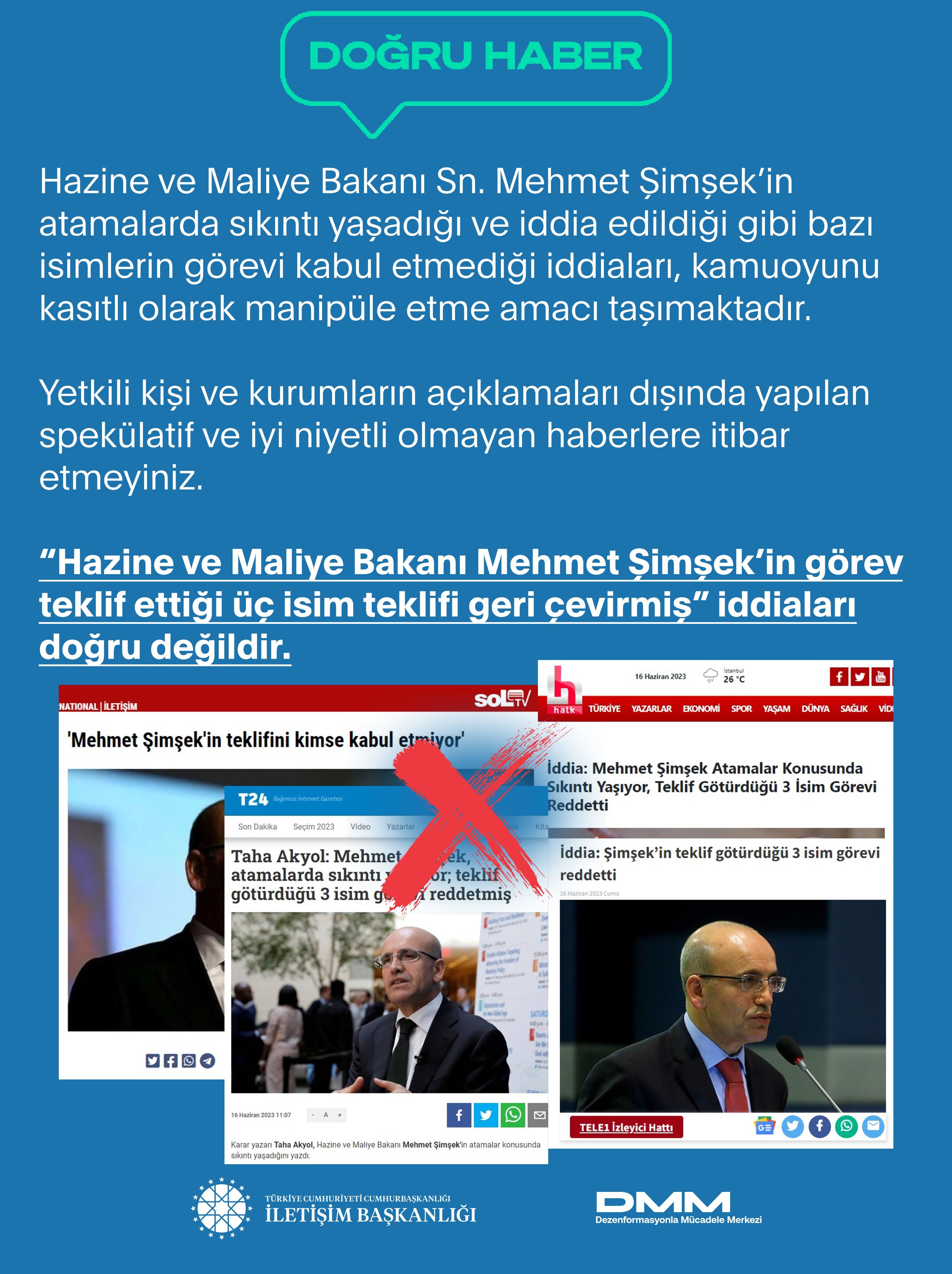 İletişim Başkanlığı Dezenformasyonla Mücadele Merkezi, "Hazine ve Maliye Bakanı Mehmet Şimşek'in görev teklif ettiği üç isim teklifi geri çevirdi." haberini yalanladı.