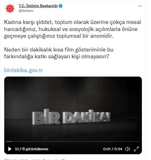 Cumhurbaşkanlığı İletişim Başkanlığı resmi sosyal medya hesabından yapılan paylaşım ile "Bir Dakika" adlı ödüllü kısa film yarışması çağrısını yineledi. Paylaşımda şu ifadeler yer aldı; “Kadına karşı şiddet, toplum olarak üzerine çokça mesai harcadığımız, hukuksal ve sosyolojik açılımlarla önüne geçmeye çalıştığımız toplumsal bir anomidir. Neden bir dakikalık kısa film gösteriminle bu farkındalığa katkı sağlayan kişi olmayasın?”