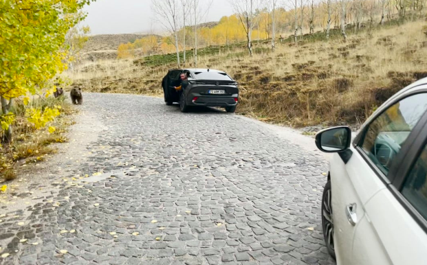 Vatandaşlar ayıları korna sesiyle uzaklaştırmaya çalışırken, o korkulu anlar cep telefonlarına da yansıdı.