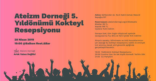 28 Nisan'da inançsızlıklarını yaymak için yeni bir argüman olarak kuruluşunun 5. yıldönümünü kullanacak olan ateistler, 'kokteyl resepsiyonu'na ünlü isimlerin katılacağı iddiasıyla 99 ile 150 liraya bilet satmaya başladı.
