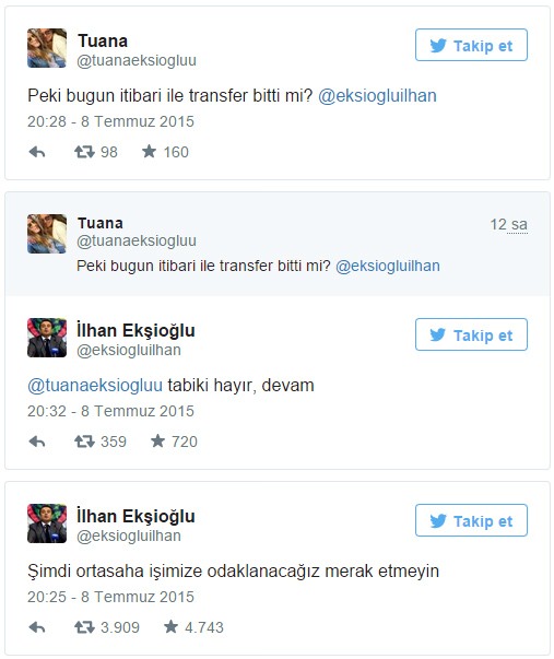 Bu cevap sonrası İlhan Ekşioğlu, attığı tweet ile sırada orta saha için transfer yapılacağının da müjdesini verdi. Orta saha için ise Freddy Guarin'in ismi ön plana çıkıyor.