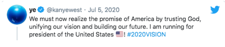 ABD'li rapçi Kanye West, Twitter'dan bir mesaj paylaşarak şunları yazdı: Şimdi ABD sözünü tanrıya güverek, vizyonumuzu birleştirerek ve gelecek inşa ederek gerçekleştirmeliyiz. ABD Başkanlığı'na adaylığımı koyuyorum."