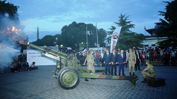 Sultanahmet Meydanı, Ramazan’ın ilk gününde binlerce vatandaşın konuk olduğu dev iftar sofrasına ev sahipliği yaptı. Meydanda toplananlar. Mekanize Piyade Tugay Komutanlığı’ndan özel olarak getirilen gerçek topun atılmasıyla oruçlarını açtı.