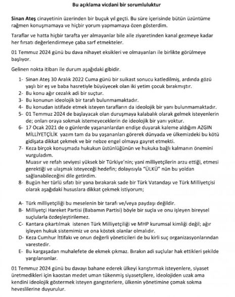 Sinan Ateş cinayetinin üzerinden 1 buçuk yıl geçtiğini ve bu süre içerisinde bütün üzüntüsüne rağmen konuşmamaya, hiçbir yorum yapmamaya özen gösterdiğini ifade eden Türkeş, "Bu konu ağır cezalık bir suçtur. Bu konunun ideolojik bir tarafı bulunmamaktadır. Konudan istifade etmek isteyen tarafların da ideolojik bir yanı bulunmamaktadır" ifadelerini kullandı.