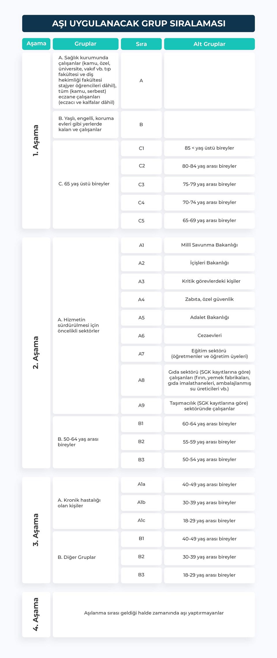 Bana korona aşı sırası ne zaman gelecek? Sağlık Bakanlığı covid19asi.saglik.gov.tr adresinde aşı olacak meslek gruplarının sıralı listesini paylaştı. Listenin yayınladığı sayfada, "Hastalığa maruz kalma, hastalığı ağır geçirme ve bulaştırma riskleri ile hastalığın toplumsal yaşamın işleyişi üzerindeki olumsuz etkisi değerlendirilerek COVID-19 aşısı uygulanacak gruplar belirlenmiş olup bu gruplara sırasıyla uygulanacaktır" açıklaması yapıldı. Korona aşı takibi e nabız üzerinden yapılmakta. Korona aşı randevusu ise MHRS üzerinden ya da e devlet üzerinden ya da ALO 182’den alınmakta.