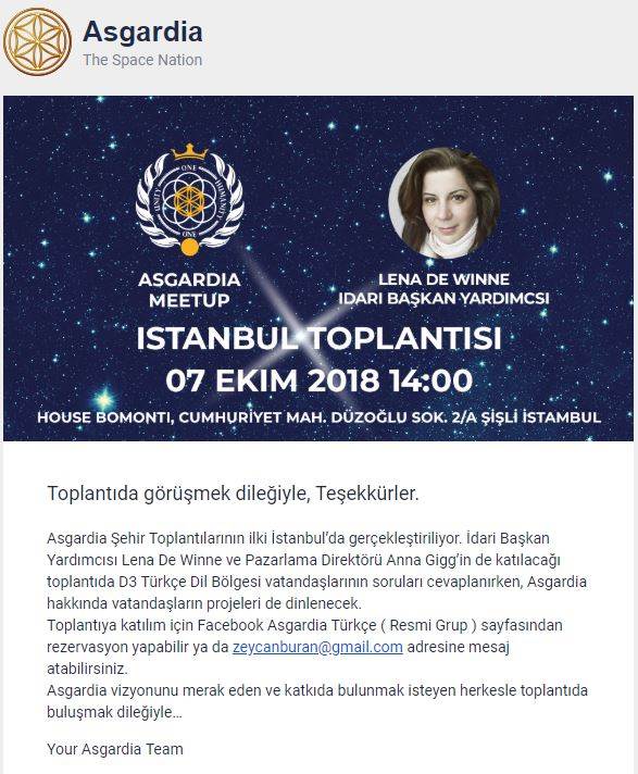 Kurulduğu günden bu yana Türkiye'den çok büyük ilgi gören uzay ülkesi Asgardia, ilk şehir toplantısını İstanbul'da yapıyor. İdari başkan yardımcısı Lena De Winne'nin de katılacağı toplantı 7 Ekim 2018'de gerçekleşecek.