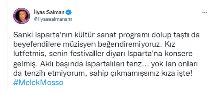 Ateist İlyas Salman, Isparta'daki konseri iptal edilen Melek Mosso'ya destek verip, Isparta halkına hakaret etti.