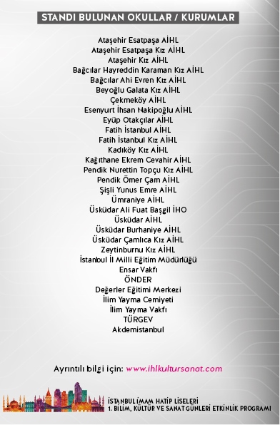 Anadolu imam hatip liselerinde öğrenim gören öğrencileri kültür, sanat ve bilim alanlarında bilinçlendirerek yetenekli öğrencileri ortaya çıkarmak, diğer öğrencileri kültür, sanat ve bilim alanlarında çalışmalar yapmaya teşvik etmek, ödüllendirmek, onları donanımlı bir şekilde geleceğe hazırlamak” amacıyla düzenlenen “İstanbul İmam Hatip Liseleri 1. Bilim, Kültür ve Sanat Günleri” İl Milli Eğitim Müdürü Dr. Muammer Yıldız ve diğer protokol mensuplarının katılımlarıyla Üsküdar Bağlarbaşı Kültür ve Kongre Merkezi’nde yapılacak açılış töreniyle başlayacak ve AİHL öğrencilerinin “bilim ve teknoloji, fotoğraf, resim, karikatür, kısa film, afiş, ebru, hat, tezhip, dergi” yarışmalarının ödül töreni ve sergisi; Anadolu imam hatip liselerinin mehter, tasavvuf musikisi, folklor, tiyatro ve ney sunumları ile Anadolu imam hatip liselerinin tanıtım stantları iki gün boyunca takip ve ziyaret edilebilecektir.