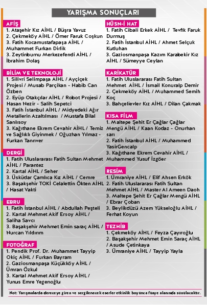 İstanbul genelindeki Anadolu imam hatip liselerine yönelik olarak İl Millî Eğitim Müdürlüğü, Ensar Vakfı, ÖNDER, İlim Yayma Cemiyeti, İlim Yayma Vakfı ve TÜRGEV işbirliğinde düzenlenen “İstanbul İmam Hatip Liseleri 1. Bilim, Kültür ve Sanat Günleri”nde AİHL öğrencilerinin "bilim ve teknoloji, kısa film, fotoğraf, resim, karikatür, afiş, hat, ebru, tezhip, hat" yarışmalarının ödül töreni ve sergisi; AİHL öğrencilerinin tasavvuf musikisi, mehter, ney folklor sunumları; AİHL'lerin tanıtım stantları yer alıyor.