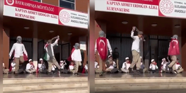 Boyunlarına Türk ve Filistin bayrağı bağlayan öğrenciler müzik eşliğinden okulun girişinde dans etti. Çocuklar dans ederken arkalarında oturun diğer arkadaşlarının da onlara ritim tutarak alkışladığı görüldü.