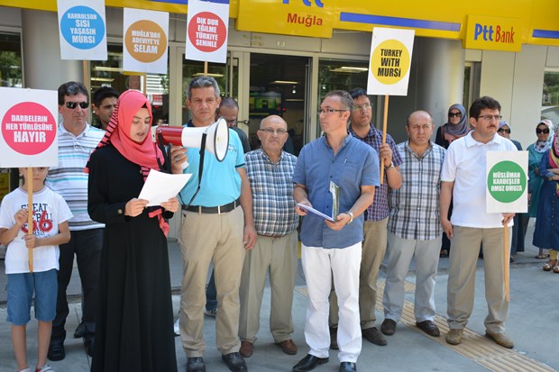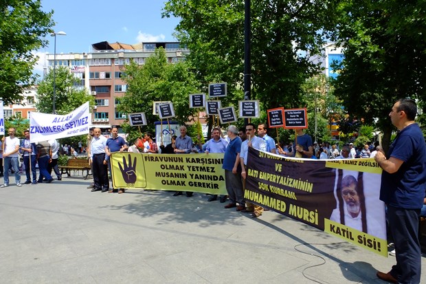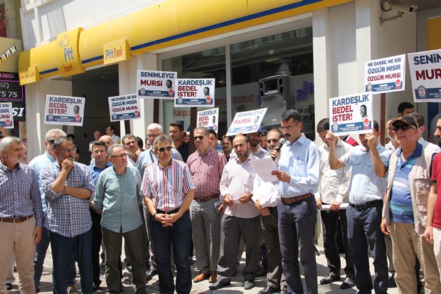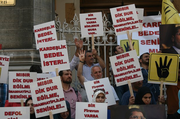 Katılımın yoğun olduğu eylemde ‘Mısır dik dur eğilme, İmam Hatipliler Seninle. Kardeşlik Bedel İster. Bir Firavun varsa binlerce Musa var’ şeklinde pankartlar açan ve dövizler taşıyan grup, '’Katil Sisi, seninleyiz Mursi'' şeklinde slogan attı.