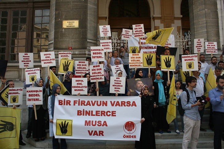 ÖNDER (İmam Hatip Mezunları ve Mensupları Derneği) üyeleri, idama mahkum edilen Mısır’ın seçimle gelen Cumhurbaşkanı Muhammed Mursi ve arkadaşların için duydukları üzüntüyü dile getirmek ve seslerini duyurmak için tüm Türkiye’de 400’e yakın mezun dernekleri ile eş zamanlı bir eylem düzenledi. Eylemin İstanbul ayağı ise Sirkeci Postanesi önünde gerçekleştirildi. Dün cuma namazı sonrası yapılan eylemde, Mısır yönetimini uyaran ÖNDER üyeleri, idam kararını kınadı.