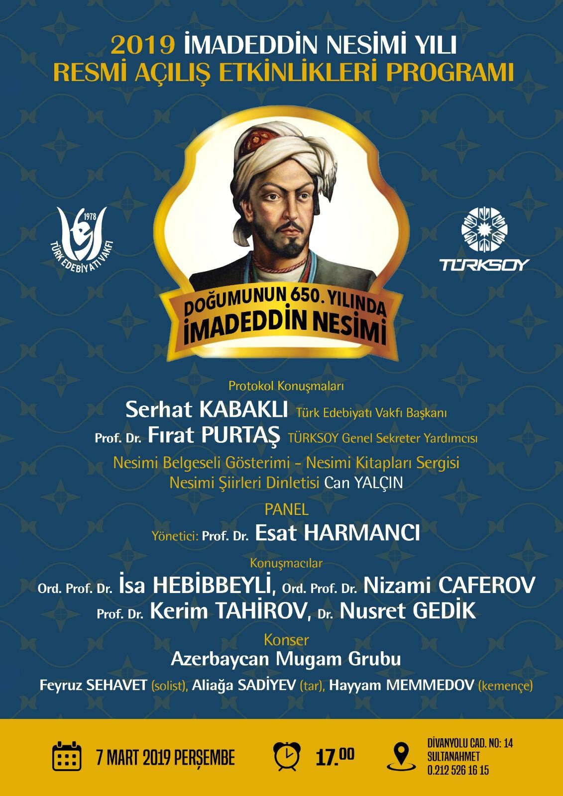 14. yy. Türk şairlerinden İmameddin Nesimi, ölümünün 650. yılında anılıyor. Türk Edebiyatı Vakfı ve TURKSOY işbirliğiyle 7 Mart 2019 Perşembe günü Sultanahmet'te düzenlenecek programa Türk Edebiyatı Vakfı Başkanı Serhat Kabaklı, TÜRKSOY Genel Sekreter Yardımcısı Prof. Dr. Fırat Purtaş, Ord. Prof. dr. İsa Hebibbeyli, Ord. Prof. Dr. Nizami Caferov, Prof. Dr. Kerim Tahirov, Dr. Nusret Gedik'in yanı sıra Azerbaycan Kültür Bakanı Ebulfez Karayev de katılıyor.
