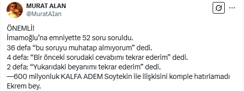 Yeni Akit Gazetesi Genel Yayın Yönetmeni Murat Alan, Ekrem İmamoğlu'nun İstanbul Emniyet Müdürlüğündeki ifadesine ilişkin önemli bilgiler paylaştı.