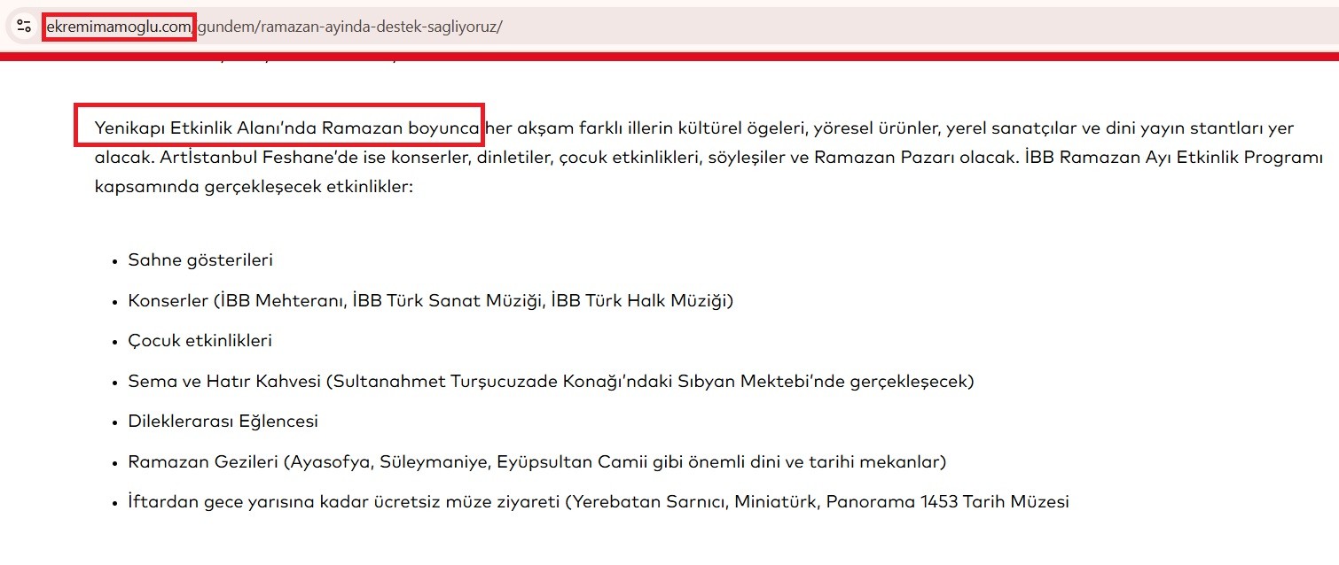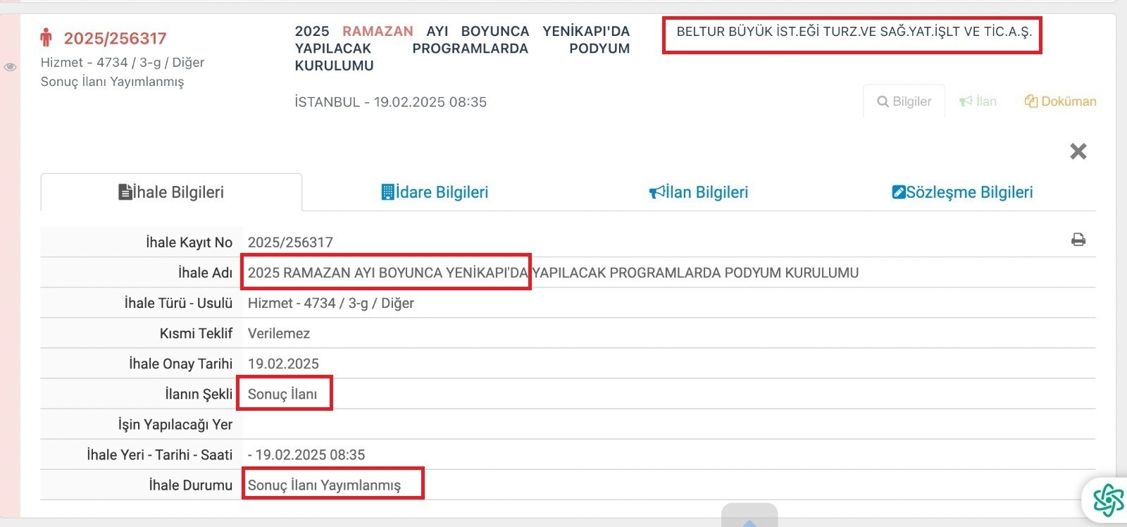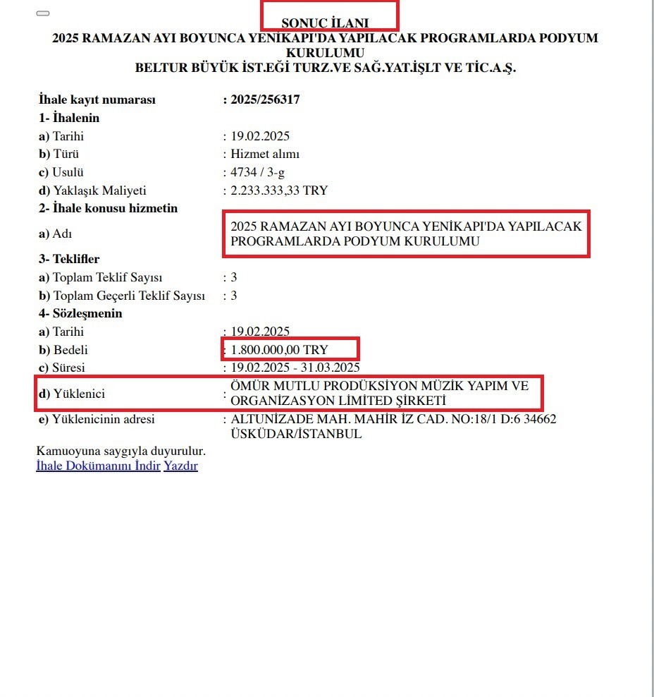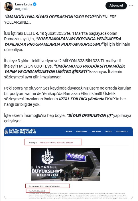 Erciş, şaibeli ihale sürecindeki gelişmeleri şu ifadelerle aktardı: "İBB iştiraki BELTUR, 19 Şubat 2025'te, 1 Mart'ta başlayacak olan Ramazan ayına yönelik hazırlıklar kapsamında, "2025 RAMAZAN AYI BOYUNCA YENİKAPI'DA YAPILACAK PROGRAMLARDA PODYUM KURULUMU" işi için bir ihale düzenliyor.