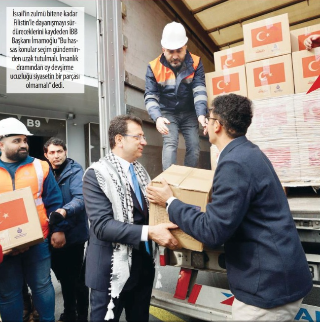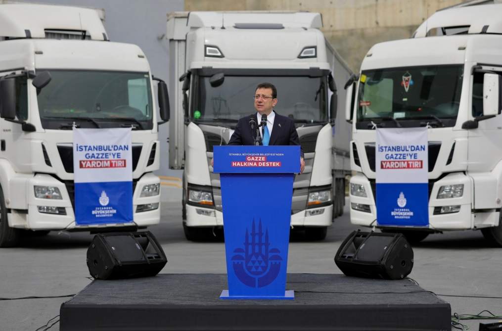 İBB Başkanı Ekrem İmamoğlu, Seçimlerden önce İstanbul’daki mahalle muhtarlarının vatandaşlardan topladığı yardımları İBB tırları aracılığı ile Gazze’ye ulaştırılmak üzere yola çıkardı. İçleri yardım malzemesi dolu 5 TIR’ı, annesi, ablası ve kardeşiyle Türkiye’de yaşayan, babası savaş nedeniyle Gazze’de mahsur kalmış Filistinli öğrenci Yusuf Bereket ile birlikte uğurladı.
