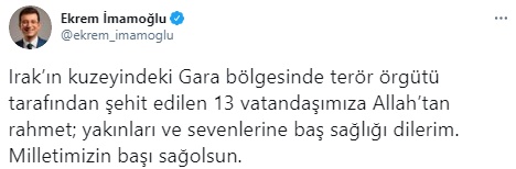 İmamoğlu da, 13 vatandaşımızın kalleşçe şehit edilmesine ilişkin paylaşımında, 'Irak'ın kuzeyindeki Gara bölgesinde terör örgütü tarafından şehit edilen 13 vatandaşımıza Allah'tan rahmet; yakınları ve sevenlerine baş sağlığı dilerim. Milletimizin başı sağolsun.' açıklamasında bulundu.