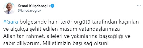 Kılıçdaroğlu sosyal medya hesabından yaptığı paylaşımda, "Gara bölgesinde hain terör örgütü tarafından kaçırılan ve alçakça şehit edilen masum vatandaşlarımıza Allah'tan rahmet, aileleri ve yakınlarına başsağlığı ve sabır diliyorum. Milletimizin başı sağ olsun!" ifadelerini kullandı.