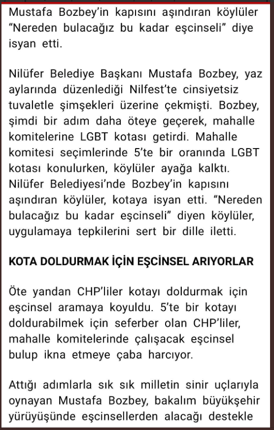 İmamoğlu’nun ekibinin açıklamalarında övdüğü ve “örnek aldığını” söylediği Nilüfer Belediyesi’nde yaşananlar ise işin şaka gibi ama gerçek boyutunu gösteriyordu. CHP'li Başkan Mustafa Bozbey'in LGBT ajandası CHP'lileri bile çileden çıkarmıştı: