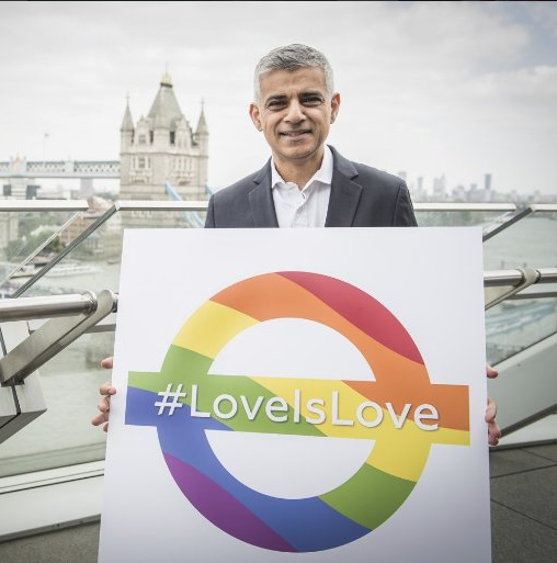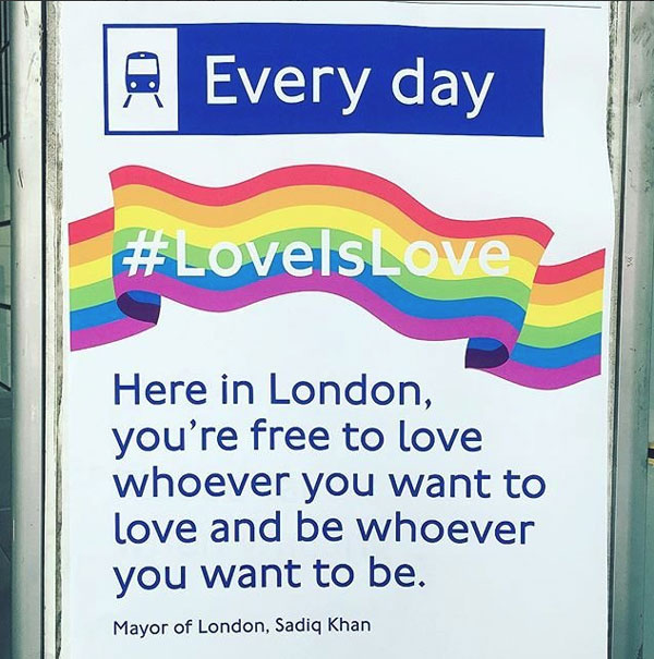 Khan'ın Londra Belediye Başkanlığına gelmesi ile sistematik LGBT propagandası da başladı, şehrin her tarafı LGBT bayrağı ile doldu. Londra metrosundan bir billboard aşağıda.