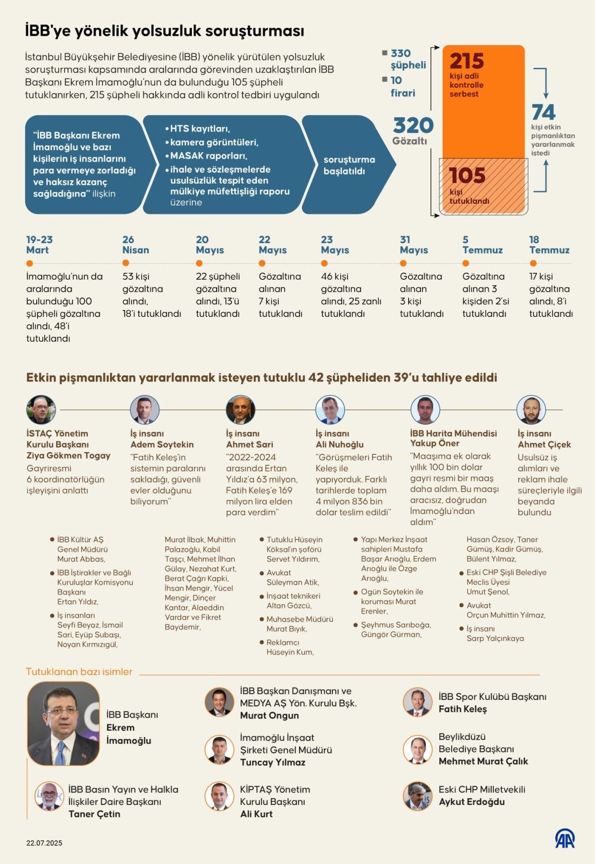 Suç örgütü elebaşı olduğu iddia edilen Ekrem İmamoğlu ile örgüt yöneticisi konumundaki şüpheliler İBB Başkan Danışmanı ve MEDYA AŞ Yönetim Kurulu Başkanı Murat Ongun, İmamoğlu İnşaat Şirketinin Genel Müdürü Tuncay Yılmaz, İBB Spor Kulübü Başkanı Fatih Keleş, Bakırköy Belediyesi Meclis üyeliğinin yanı sıra İBB İştirakler ve Bağlı Kuruluşlar Komisyonu Başkanı olan Ertan Yıldız ile Beylikdüzü Belediye Başkanı Mehmet Murat Çalık ve bu şüphelilerle bağlantılı 94 şüpheliye yönelik gözaltı, arama ve el koyma kararı verildi.