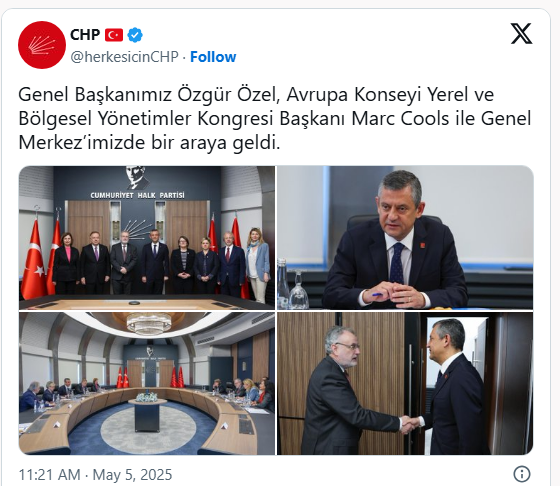 Avrupa Konseyi'ne bağlı Avrupa Yerel ve Bölgesel Yönetimler Kongresi, 5-6 Mayıs tarihlerinde Türkiye'ye gerçekleştirdiği ziyaret kapsamında, 23 Mart'ta tutuklanan İstanbul Büyükşehir Belediyesi (İBB) Başkanı Ekrem İmamoğlu'nu Silivri Cezaevi'nde ziyaret etti.