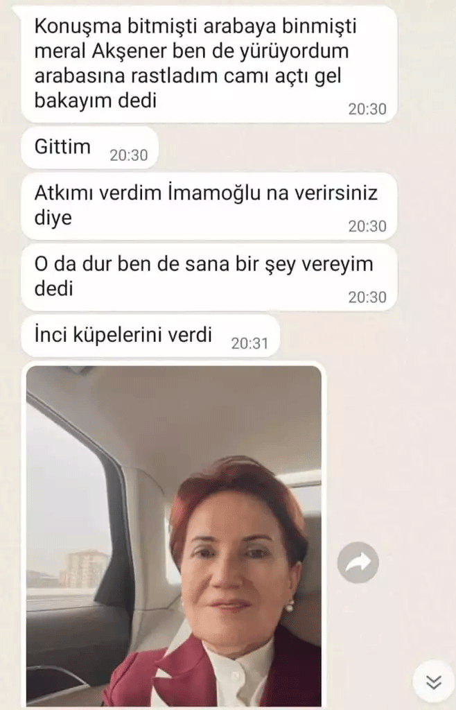 İYİ Parti lideri Meral Akşener, Saraçhane'de düzenlenen mitingde İBB Başkanı Ekrem İmamoğlu'na boynundaki atkıyı verdi. Atkıyı genç bir kadının verdiğini söyleyen Meral Akşener'in kurgu yaptığı iddia edildi. Ancak, atkı olayını arkadaşına anlatan genç kadının mesajları ortaya çıktı. Mesajın ise kurgu olup olmadığı belirsizliğini koruyor.
