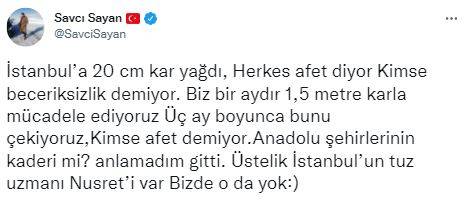 İBB yönetimine bir tepki de Ağrı Belediye Başkanı Savcı Sayan'dan geldi. Sosyal medya hesabından açıklama yapan Sayan, ''İstanbul’a 20 cm kar yağdı, Herkes afet diyor Kimse beceriksizlik demiyor. Biz bir aydır 1,5 metre karla mücadele ediyoruz Üç ay boyunca bunu çekiyoruz,Kimse afet demiyor.Anadolu şehirlerinin kaderi mi? anlamadım gitti. Üstelik İstanbul’un tuz uzmanı Nusret’i var Bizde o da yok.'' ifadelerini kullandı.