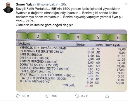 Skandallarıyla gündemden düşmeyen CHP'li İBB Başkanı Ekrem İmamoğlu'nun koronavirüs salgını nedeniyle başlattığı yardım kampanyası büyük tepki topladı. Fiyatları 50-60 TL arasında değişen gıda paketlerini 150 TL'den satan İmamoğlu'nu savunmak ise halkçı geçinen Soner Yalçın'a düştü. Kaliteli beslenmeye özen gösterdiğini söyleyerek fahiş fiyatları savunan Yalçın, 212 TL'lik alışveriş yaptığını dile getirdi ancak yaptığı bu hesap tutmadı.