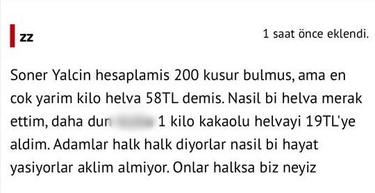 Bir başka kullanıcısı ise yaptığı yorumda, "Yarım kilo helva 58 TL. Halk adamı solcu Soner bu ne perhiz bu ne lahana turşusu kardeş" ifadelerini kullandı.