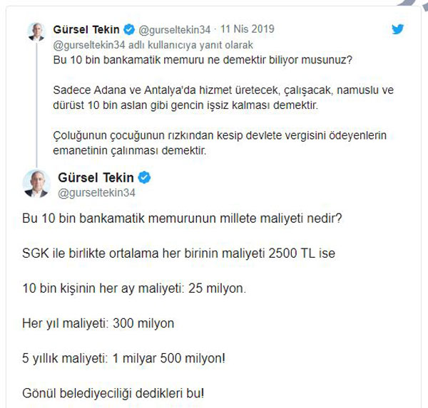 “Gürsel Tekin, ‘Antalya Büyükşehir Belediye Başkanımız Sn. Muhittin Böcek, tam 4.000 bankamatik memurunun işine son verdi. Adana'da bankamatik memuru sayısı yaklaşık 6.000. Sn. Zeydan Karalar, bu kişiler için gerekeni yapacağını açıkladı.’ demişti. O günden sonra, hem Adana’nın hem de Antalya’nın bir önceki belediye başkanları Tekin’i ispata çağırdılar. Hak İş Genel Başkanı Mahmut Arslan, bunun büyük bir iftira olduğunu söyledi. O günden sonra, bu iddiaların tamamen yalan olduğu ortaya çıktı. Bugün, İstanbul Büyükşehir Belediye Başkanı Ekrem İmamoğlu’nun İstanbul’da yaptıklarına bakınca, Gürsel Tekin’in o günlerden kamuoyunu hazırlamaya çalıştığını görüyoruz.”