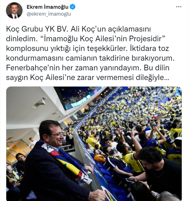 Ali Koç'a Twitter hesabından cevap veren İmamoğlu, "Koç Grubu YK BV. Ali Koç’un açıklamasını dinledim. 'İmamoğlu Koç Ailesi’nin Projesidir' komplosunu yıktığı için teşekkürler. İktidara toz kondurmamasını camianın takdirine bırakıyorum. Fenerbahçe’nin her zaman yanındayım. Bu dilin saygın Koç Ailesi’ne zarar vermemesi dileğiyle…" dedi.