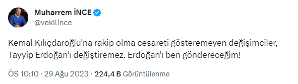 Twitter hesabından paylaşımda bulunan Muharrem İnce, mesajında, "Kemal Kılıçdaroğlu'na rakip olma cesareti gösteremeyen değişimciler, Tayyip Erdoğan'ı değiştiremez. Erdoğan'ı ben göndereceğim!" ifadelerini kullandı.