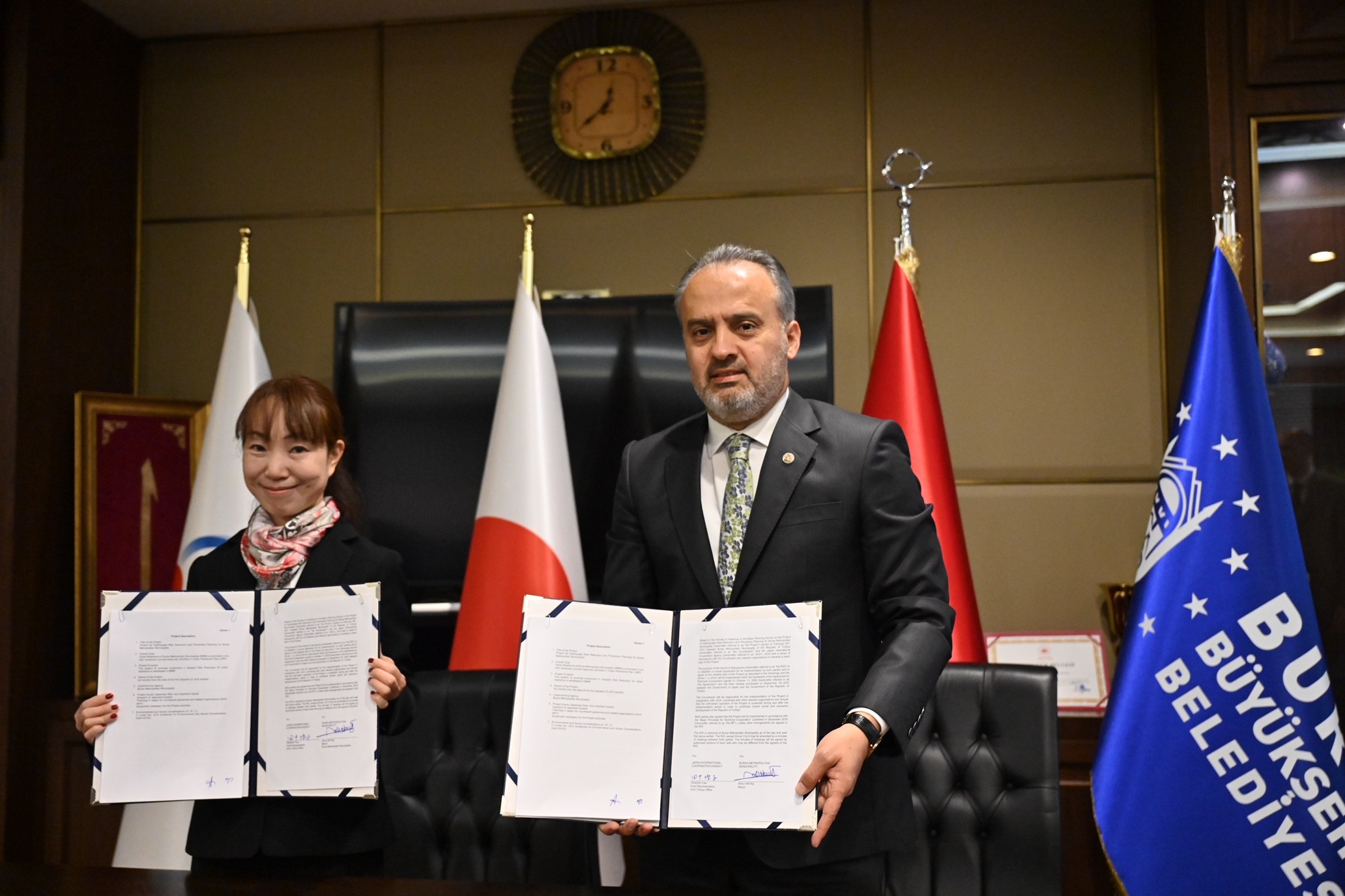 Bursa'nın geleceğini yakından ilgilendiren işbirliği protokolü, Büyükşehir Belediye Başkanı Alinur Aktaş ile JICA Türkiye Ofisi Başkanı YukoTanaka arasında imzalandı. İmza töreninde; JICA Türkiye Ofisi Başkan Yardımcısı YurikaSaito, Büyükşehir Belediyesi Genel Sekreteri Ulaş Akhan, Genel Sekreter Yardımcısı Gülten Kapıcıoğlu, Bursa Uludağ Üniversitesi Rektör Yardımcısı Prof. Dr. Adem Doğangün, Bursa Teknik Üniversitesi Rektör Yardımcısı Prof. Dr. Beyhan Bayhan ve KOÜ Yerfiziği Anabilim Dalı Başkanı Prof. Dr. Şerif Barış da hazır bulundu.