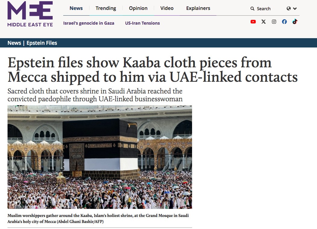 Londra merkezli Middle East Eye sitesinin haberine göre yeni yayınlanan dosyalar arasında, Mekke’deki Kabe’den Amerika’ya gönderilen Kabe örtüsü parçaları, Birleşik Arap Emirlikleri (BAE) ile bağlantılı kişiler aracılığıyla organize edildiği ve çocuk istismarcısı Jeffrey Epstein’e teslim edildiği detaylarını içeren e-postalar da yer alıyor.