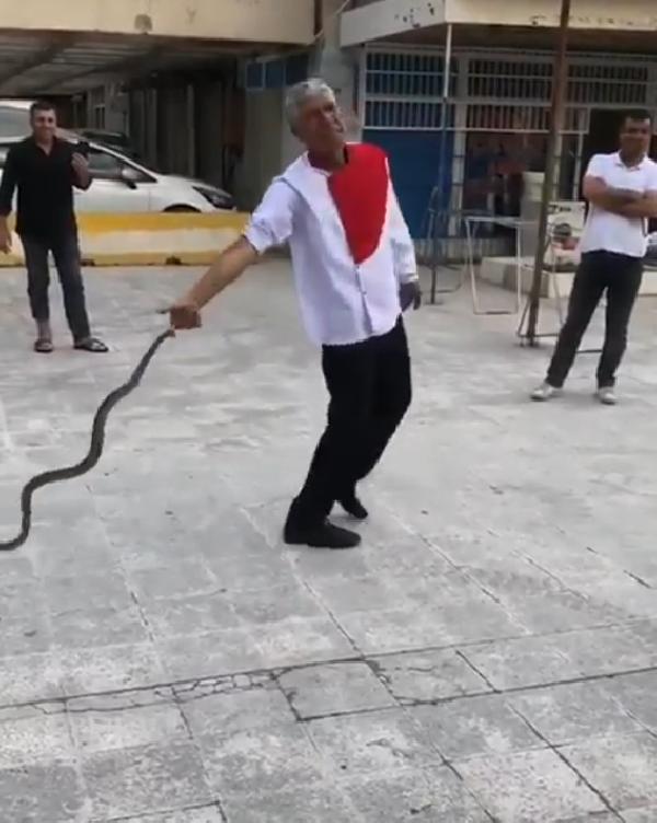 Adana'nın Seyhan ilçesindeki Adana Merkez Otogarı'nda çevredekilerin meraklı bakışları arasında eline aldığı uzun bir yılanla şov yapmaya başlayan Osman Aslan parmağını yılana ısırttı.