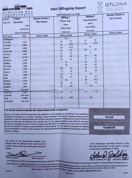 Faruk Ünal, bu konuda gerçeği öğrenmek için S.N.'nin ailesini ve eski patronunu sıkıştırmaya devam edince N. ailesinin en küçük oğlu F.N. DNA testi yaptırmaya karar verdi. Ünal ve F.N.’den alınan kan örnekleri özel bir hastaneye verildi. Hastane de örnekleri test için İngiltere’ye gönderdi. Bir süre sonra gelen rapor, Ünal ve F.N.’nin yüzde 99.86 kardeş olduğunu gösteriyordu.