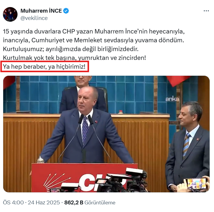 Muharrem İnce, “15 yaşında duvarlara CHP yazan Muharrem İnce’nin heyecanıyla, inancıyla, Cumhuriyet ve Memleket sevdasıyla yuvama döndüm. Kurtuluşumuz; ayrılığımızda değil birliğimizdedir. Kurtulmak yok tek başına, yumruktan ve zincirden! Ya hep beraber, ya hiçbirimiz!” diye yazdı.